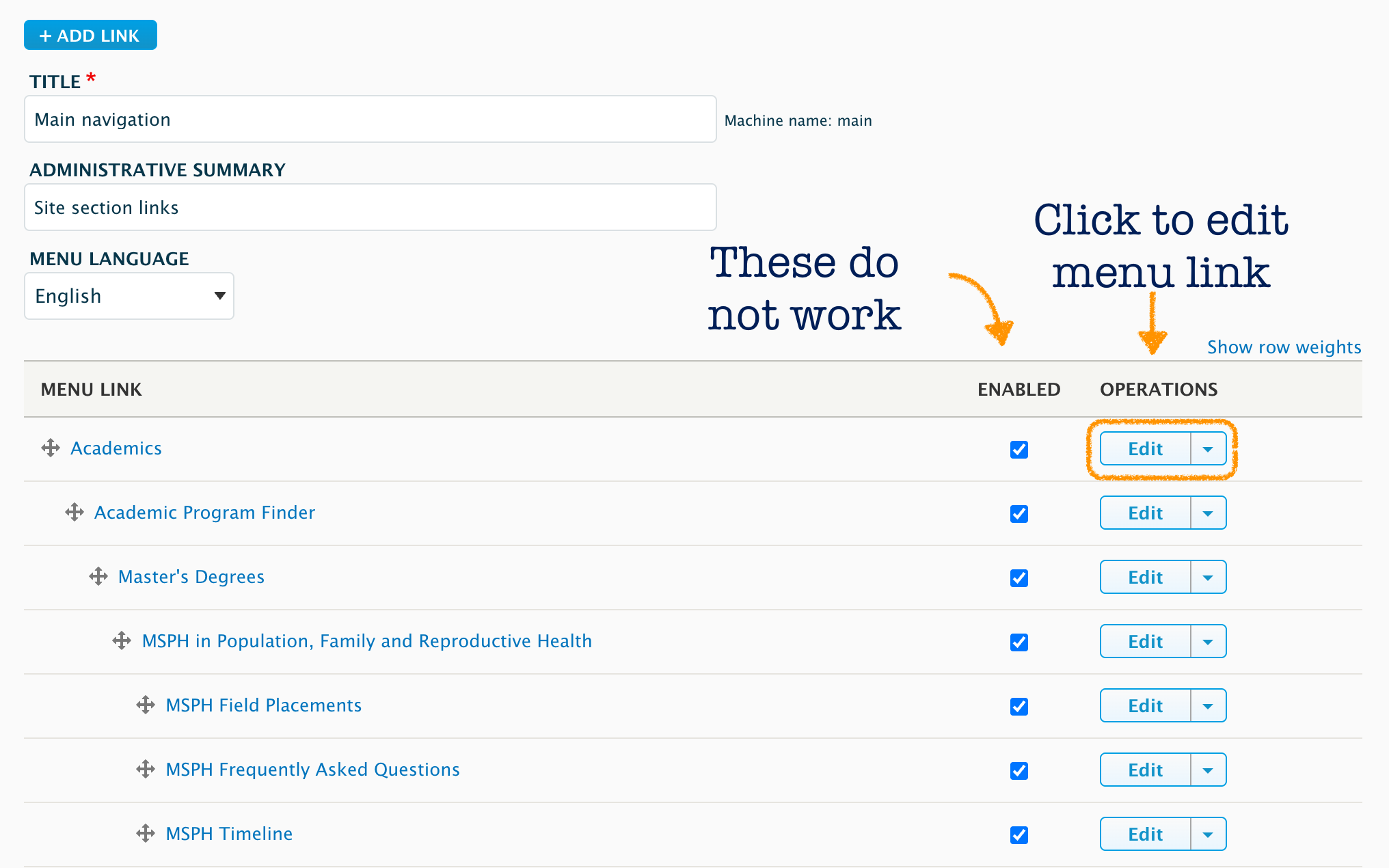 Although it should be possible to do this from the list of menu links (as seen in step 4) by unchecking the Enabled checkboxes and then saving, this feature was not functioning properly becuase of the size of our menu. Instead we need to make this change by editing the menu link.