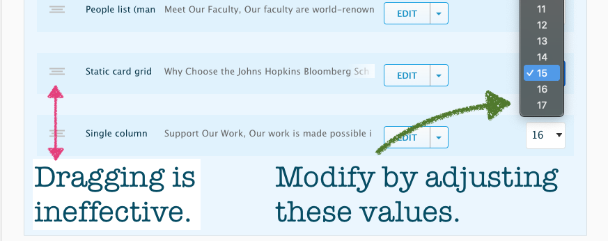 There's currently a bug that prevents users from dragging components to reorder them when editing a page. As a workaround, please use the number field on the right side of each component to change the order instead. While effective, this method isn't as user-friendly, especially for longer component lists, and may require more than one attempt to set accurately. Please preview and review your drafts carefully.