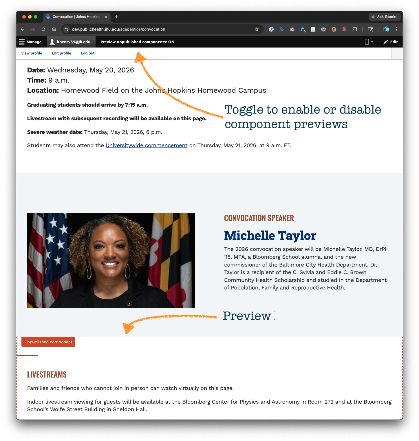 - Log in to Drupal and navigate to the page you’re working on (for example, the Convocation page).